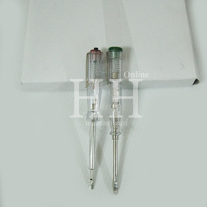 ไขควงลองไฟ มี 2แบบ มีแบบหัวกด ยี่ห้อ STAR และ แบบหัวเดี่ยว(ไม่ต้องกด แค่เสียบ) ยี่ห้อ META จำหน่ายเป็นโหล